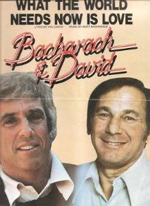 In the 1960s and early 1970s, Bacharach and David wrote some of the most enduring pop songs of all time. Their classic hits included ‘Raindrops Keep Fallin’ on My Head’, ‘This Guy’s in Love with You’, ‘I’ll Never Fall in Love Again’, ‘Do You Know the Way to San Jose’, ‘Walk On By’, ‘What the World Needs Now Is Love’, ‘I Say a Little Prayer’, ‘The Look of Love’, and ‘Anyone Who Had a Heart’, amongst many others.